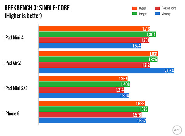 จากตารางข้างต้นเห็นได้ว่า iPad Mini 4 จะเป็นรองเพียง iPad Air 2 เท่านั้น เพราะ iPad Air 2 ใช้หน่วยประมวลผลแบบ Tri-Core A8X 1.5GHz ซึ่งมีแกนประมวลผลมากกว่า ส่งผลให้ iPad Air 2 เร็วกว่า iPad Mini 4 ประมาณ 50% แต่สิ่งสำคัญอยู่ที่ขีดความสามารถของ iPad Mini 4 ที่เพิ่มสูงขึ้นจาก iPad Mini 2 และ Mini 3 อยู่ประมาณ 20% อันเนื่องมาจากหน่วยความจำแรมที่มีขนาดเพิ่มขึ้น ซึ่งช่วยในการใช้งาน Multitask, การประมวลผลเมื่อเปิดแท็บในเบราว์เซอร์ Safari ดีขึ้น และเพิ่มประสิทธิภาพการสับเปลี่ยนแอปพลิเคชันไปมาให้ดียิ่งขึ้น