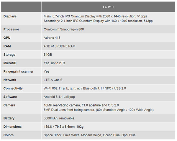 คุณสมบัติของ LG V10 ได้แก่ หน้าจอขนาด 5.7 นิ้ว แบบ IPS Quantum Display ความละเอียดเทียบเท่าระดับ 2K (1440x2560 พิกเซล) แต่มีการแสดงผลของสีที่สมจริงกว่า 20%, ใช้หน่วยประมวลผลชิปเซ็ต Hexa-Core Qualcomm Snapdragon 808, หน่วยประมวลผลกราฟิก (GPU) Adreno 418, หน่วยความจำแรม (RAM) แบบ LPDDR3 ขนาด 4 GB, หน่วยความจำภายใน 64 GB สามารถเพิ่มหน่วยความจำแบบ microSD ได้สูงถึง 2 TB และแบตเตอรี่ 3000 mAh นอกจากนี้ยังรองรับเทคโนโลยี Quick Charge 2.0 ซึ่งชาร์จแบตเตอรี่ได้ 50 เปอร์เซ็นต์ภายใน 40 นาที