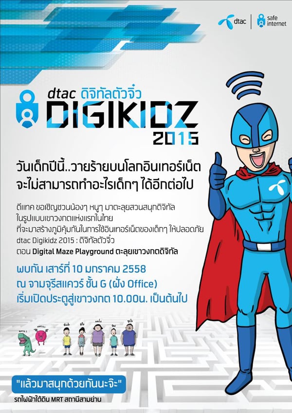 วันที่เด็กๆ รอคอยมาแล้ววววววว... วันเด็กปีนี้ ดีแทค จัดกิจกรรมสุดล้ำ dtac Digikidz 2015 : ดิจิทัลตัวจิ๋ว ตอน Digital Maze Playground ตะลุยเขาวงกตดิจิทัล ครั้งแรกในเมืองไทย ที่จะให้น้องๆ หนูๆ มาสแกรนภูมิคุ้มกันในการใช้อินเทอร์เน็ตอย่างปลอดภัยกับเกมส์สนุกสุดไฮเทคที่เด็กๆ ไม่ควรพลาด!! โดยเฉพาะคุณพ่อคุณแม่ยุคใหม่ที่อาจจะปล่อยให้ลูกๆ เล่นเกมส์อยู่กับไอแพดและมือถือแล้วคิดว่าคือการเปิดจินตนาการสู่โลกกว้าง อาจจะมาพร้อมกับภัยโดยไม่รู้ตัวก็ได้ ชวนน้องๆ มาเรียนรู้วัคซีนคุ้มกันภัยอินเทอร์เน็ต พร้อมชมหนังการ์ตูนอนิเมชั่นเรื่อง D-Hero พิทักษ์โลก ก่อนใคร!!โดยพี่ D-Hero ซุปเปอร์ฮีโร่ที่อินเทรนด์สุดๆ