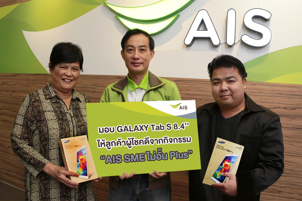 เอไอเอส SME โดย นายสุโชติ ตรีลักษณวรรณ ผู้อำนวยการส่วนการขายและการตลาด มอบรางวัล SAMSUNG GALAXY TAB S 8.4 LTE รวม 84,500 บาท ให้ลูกค้าผู้โชคดีจากกิจกรรม AIS SME ไม่อั้น Plus ที่ร่วมสนุกโดยการแชร์ประสบการณ์สู่ความสำเร็จของธุรกิจตนเองเข้ามาผ่านช่องทาง Online ติดตามกิจกรรมดีๆ สำหรับผู้ประกอบการธุรกิจ SME ทั่วประเทศครั้งต่อไปได้ทาง www.ais.co.th/sme