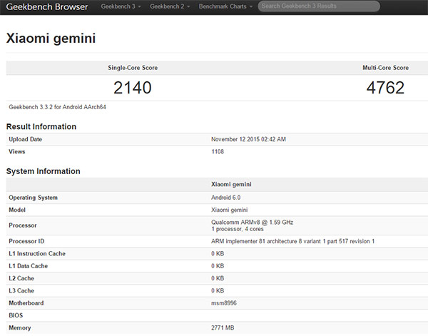 ตามข้อมูลจากเว็บไซต์ GFXBench เผยให้เห็นข้อมูลเบื้องต้นของ Xiaomi Gemini ที่ใช้หน่วยประมวลผลชิปเซ็ต MSM8996 ซึ่งเป็นชื่อรหัสของชิปเซ็ต Qualcomm Snapdragon 820 รุ่นล่าสุด และมีหน่วยความจำแรม (RAM) ขนาด 3 GB รวมทั้งมาพร้อมระบบปฏิบัติการ Android 6.0 Marshmallow เวอร์ชันล่าสุด