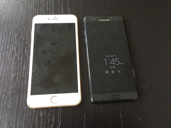 แม้ว่า Samsung Galaxy Note7 จะมาพร้อมกับหน้าจอขนาด 5.7 นิ้ว ซึ่งใหญ่กว่า iPhone 6S Plus ที่มาพร้อมกับหน้าจอขนาด 5.5 นิ้วเล็กน้อย แต่เมื่อเปรียบเทียบดีไซน์ของทั้ง 2 เครื่อง จะเห็นว่า Samsung Galaxy Note7 มีขนาดที่เพรียวบางกว่า และเล็กกว่า ทำให้การจับมือและใช้งานสะดวกมากขึ้น