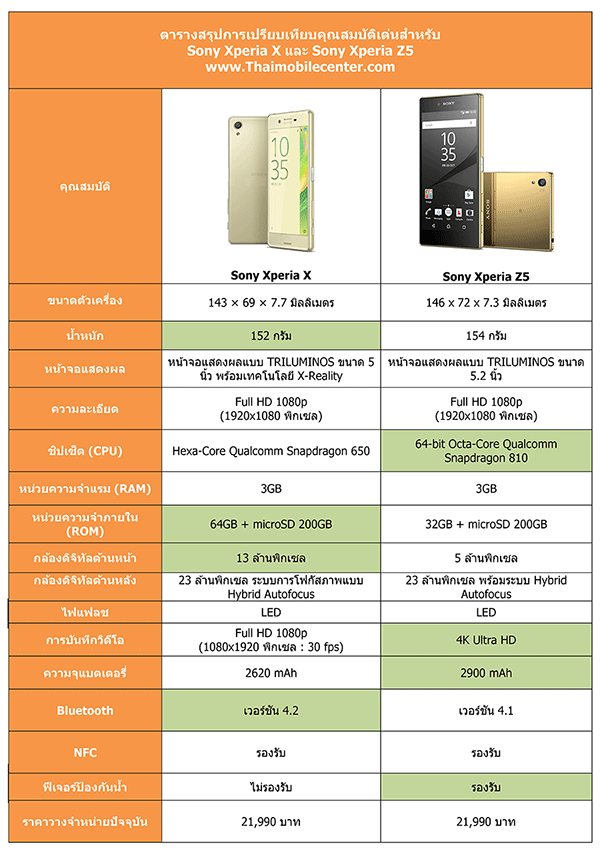 ดังนั้น เมื่อสมาร์ทโฟน Sony Xperia X และ Sony Xperia Z5 มีราคาวางจำหน่ายเท่ากัน ผู้ใช้หลายท่านจึงเกิดข้อสงสัยว่า แล้วทั้งสองรุ่นแตกต่างกันอย่างไร ฟีเจอร์ใช้งานเหมือนกันหรือไม่ และซื้อรุ่นไหนจะคุ้มค่ากว่ากัน วันนี้ทีมงาน Thaimobilecenter จึงได้นำสมาร์ทโฟนทั้งสองรุ่นมาเปรียบเทียบกันให้ทุกท่านได้เห็นชัดๆ ว่า แต่ละรุ่นมีจุดเด่นอย่างไร และแตกต่างกันตรงส่วนใดบ้าง เพื่อเป็นข้อมูลประกอบการตัดสินใจในการเลือกซื้อของผู้ใช้ หากพร้อมแล้วขอเชิญทุกท่านติดตามชมการเปรียบเทียบ Sony Xperia X และ Sony Xperia Z5 ไปพร้อมกันได้เลยครับ