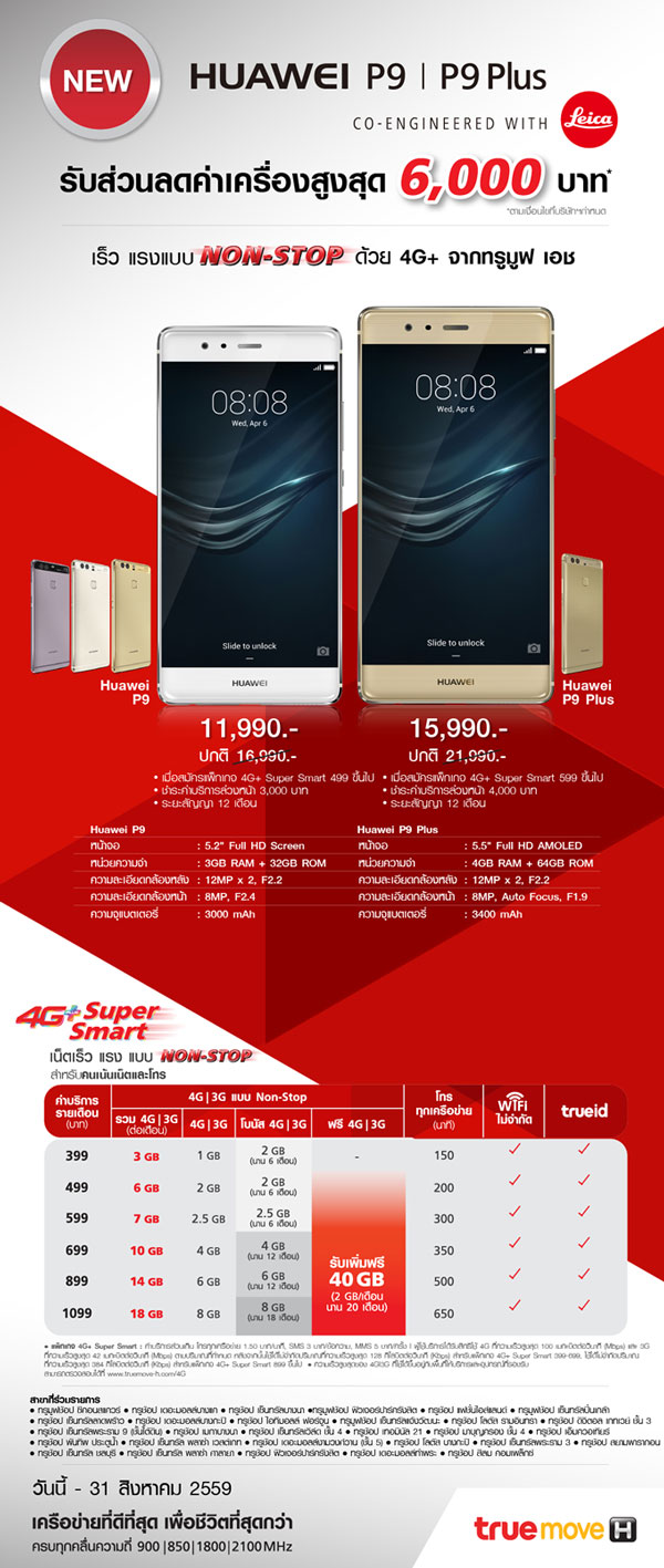 โดยราคาของ Huawei P9 จาก TrueMove H นั้น จากราคาเครื่องเปล่า 16,990 บาท เหลือเพียง 11,990 บาท ลดไป 5,000 บาท เมื่อสมัครแพ็กเกจ 4G+ Super Smart 499 ขึ้นไป พร้อมชำระค่าบริการล่วงหน้า 3,000 บาท และติดสัญญานาน 12 เดือน ส่วนราคา Huawei P9 Plus จากราคาปกติ 21,990 บาท เหลือ 15,990 บาท ลดไป 6,000 บาท เมื่อสมัครแพ็กเกจ 4G+ Super Smart 599 ขึ้นไป พร้อมชำระค่าบริการล่วงหน้า 4,000 บาท และติดสัญญานาน 12 เดือน