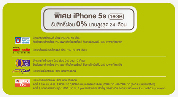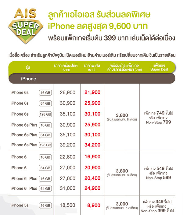 โปรโมชัน AIS Super Deal มอบส่วนลดพิเศษให้กับลูกค้าด้วยการลดราคา iPhone 5s เหลือเพียง 8,900 บาท จากราคาเต็ม 18,500 บาท เพียงแค่สมัครแพ็กเกจ 349 บาทขึ้นไป หรือแพ็กเกจ Non-Stop 399 บาทขึ้นไป พร้อมชำระค่าบริการล่วงหน้าเพียง 3,000 บาท และได้รับส่วนลดนานถึง 12 เดือนเต็ม ซึ่งครอบคลุมกลุ่มลูกค้าทั้งหมดไม่ว่าจะเป็น ลูกค้าปัจจุบัน, เปิดเบอร์ใหม่, ย้ายค่ายเบอร์เดิม หรือเปลี่ยนจากเติมเงินเป็นรายเดือนก็สามารถรับสิทธิ์นี้ได้เช่นเดียวกัน นอกจากนี้ลูกค้ายังสามารถรับสิทธิ์ผ่อน 0% นานสูงสุด 24 เดือน อีกด้วย