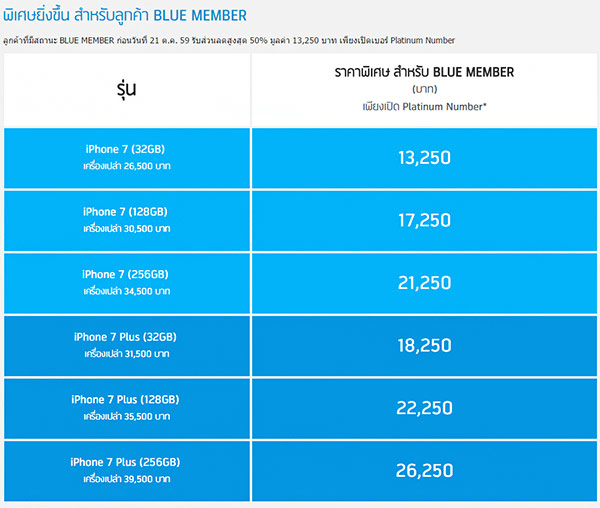 สำหรับลูกค้าที่มีสถานะ BLUE MEMBER ก่อนวันที่ 21 ตุลาคม 2559 ที่ผ่านมา จะได้รับส่วนลดในการสั่งซื้อ iPhone 7 และ iPhone 7 Plus สูงสุด 50% จึงสามารถสั่งซื้อ iPhone 7 และ iPhone 7 Plus (32GB) ได้ในราคาเพียง 13,250 บาท และ 18,250 บาทเท่านั้น เพียงเปิดใช้งาน Platinum Number เบอร์สวยที่ลงท้ายด้วย 1111-7777 หรือเบอร์ Silver Dragon และสมัครใช้งานแพ็กเกจรายเดือน Super Non-Stop 1,499 บาทขึ้นไป พร้อมชำระค่าบริการล่วงหน้า 6 เดือน