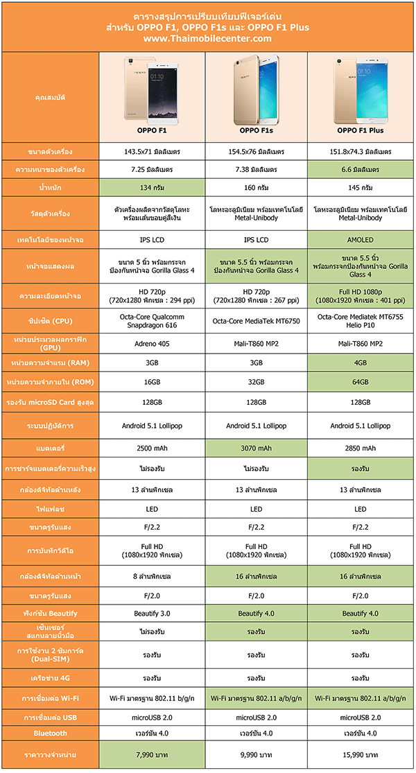 เรียกได้ว่าสมาร์ทโฟนตระกูล F1 Series ที่มาพร้อมกับฉายา Selfie Expert ได้รับความนิยมจากผู้ใช้อยู่ไม่น้อยเลยทีเดียว ด้วยความโดดเด่นที่ไม่ใช่เพียงแค่กล้องถ่ายภาพสำหรับเซลฟี่ แต่ยังมีการดีไซน์ตัวเครื่องสวยหรูที่ผลิตจากวัสดุระดับพรีเมียมด้วยเช่นกัน และด้วยความพิเศษเหนือใคร ทางทีมงาน Thaimobilecenter จึงนำสมาร์ทโฟนทั้ง 3 รุ่นจากตระกูล F1 Series มาทำการเปรียบเทียบให้ได้ชมกันแบบช็อตต่อช็อต ว่าระหว่าง OPPO F1, F1s และ F1 Plus จะมีความแตกต่างกันมากน้อยเพียงใด เพื่อเป็นแนวทางสำหรับผู้ที่สนใจสมาร์ทโฟนในตระกูลนี้ ซึ่งสามารถรับชมรายละเอียดการเปรียบเทียบฟีเจอร์เด่นของทั้ง 3 รุ่นจากตารางที่อยู่ด้านล่างนี้ได้เลยค่ะ