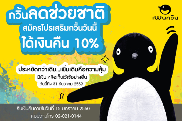เพนกวินส่งท้ายปี กวิ้นลดช่วยชาติ สมัครโปรเสริมกวิ้นวันนี้ ได้เงินคืน 10%