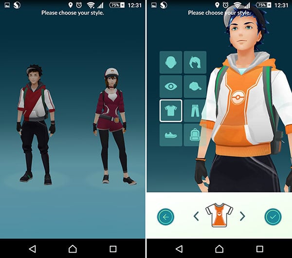 จากนั้น เมื่อเราทำการกำหนดรูปลักษณ์ของตัวละครเสร็จสิ้นแล้ว ก็จะถึงขั้นตอนการเลือกโปเกมอนครั้งแรก โดยรอบๆ ตัวเราจะปรากฏโปเกมอนขึ้นมา 3 ตัว ได้แก่ ฟุชิกิดาเนะ (Bulbasaur), ฮิโตคาเงะ (Charmander) และเซนิกาเมะ (Squirtle) เมื่อเลือกโปเกมอนตัวที่ถูกใจได้แล้วก็สามารถใช้นิ้วจิ้มไปที่โปเกมอนตัวนั้น เพื่อเข้าสู่ฉากการจับโปเกมอนได้ทันที