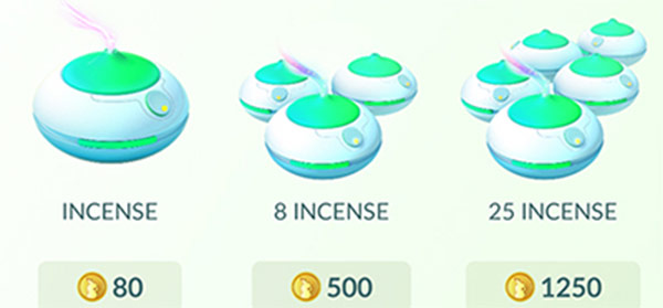 Incense - ไอเทมที่จะปล่อยกลิ่นออกมาล่อโปเกมอนให้เกิดใกล้ตัวผู้เล่น ทำให้เจอโปเกมอนได้ง่ายขึ้น เหมาะสำหรับใช้งานขณะเดินทางจะได้ผลสูงกว่าการใช้งานขณะอยู่กับที่ ไอเทมชิ้นนี้มีผล 30 นาที