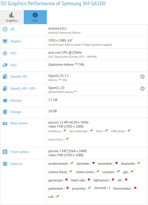 รายชื่อของ SM-G610F ที่คาดว่าเป็น Samsung Galaxy On7 เวอร์ชันอัปเกรดปี 2016 ได้ไปปรากฎอยู่บนฐานข้อมูลเว็บไซต์ Zauba ที่ทำหน้าที่ตรวจสอบ และทดสอบสินค้านำเข้าของประเทศอินเดียเมื่อไม่กี่วันที่ผ่านมา พร้อมกับไปปรากฎอยู่บนเว็บไซต์ทดสอบประสิทธิภาพการทำงานของสมาร์ทโฟน และแท็บเล็ตชื่อดังอย่าง GFXBench ในชื่อโมเดล SM-G6100 ด้วยเช่นกัน ซึ่งเผยให้เห็นคุณสมบัติในเบื้องต้นของตัวเครื่องอย่างชัดเจน ได้แก่ หน้าจอแสดงผลขนาด 4.8 นิ้ว ความละเอียดระดับ Full HD 1080p (1080x1920 พิกเซล), ชิปเซ็ตประมวลผล Octa-Core Qualcomm Snapdragon 625, หน่วยประมวลผลกราฟิก (GPU) Adreno 506, หน่วยความจำแรม (RAM) ขนาด 3GB, หน่วยความจำภายใน (ROM) ขนาด 16GB, กล้องดิจิทัลด้านหลังความละเอียด 13 ล้านพิกเซล พร้อมกล้องดิจิทัลด้านหน้าความละเอียด 8 ล้านพิกเซล และทำงานอยู่บนระบบปฏิบัติการ Android 6.0 Marshmallow