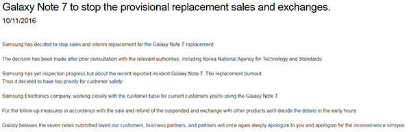 Samsung ได้ประกาศหยุดการจำหน่าย Samsung Galaxy Note7 ทั่วโลกอย่างเป็นทางการ หลังจากเกิดปัญหากับตัวเครื่องล็อตใหม่ที่ Samsung ได้ดำเนินการผลิตใหม่ และแก้ไขปัญหาเรื่องแบตเตอรี่เรียบร้อยแล้ว แต่กลับมี Samsung Galaxy Note7 ล็อตใหม่บางเครื่องเกิดการลุกไหม้อย่างไม่ทราบสาเหตุ ซึ่งทาง Samsung ได้เร่งดำเนินการตรวจสอบหาสาเหตุของปัญหาทันที พร้อมทั้งประกาศเตือนให้ผู้ใช้ Samsung Galaxy Note7 ทุกคนปิดเครื่อง หรือหยุดการใช้งานทันที แล้วนำตัวเครื่องไปแลกเงินคืน หรือแลกสมาร์ทโฟนเครื่องใหม่ ตามที่เครือข่ายผู้ให้บริการแต่ละประเทศจะมีข้อเสนอให้ พร้อมเน้นย้ำอย่างชัดเจนว่า ความปลอดภัยของผู้บริโภคเป็นสิ่งที่ Samsung ให้ความสำคัญสูงสุด