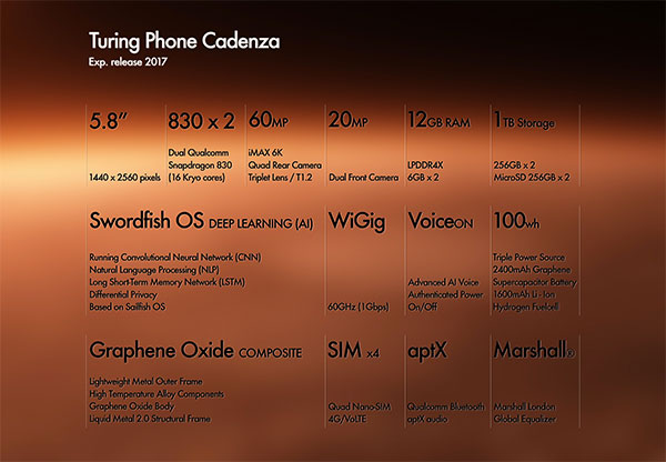 Turing Phone Cadenza ที่สุดแห่งสมาร์ทโฟนเรือธงที่ไฮเทคที่สุดในโลก! จัดเต็มด้วยชิปเซ็ต Snapdragon 830 2 ตัว, RAM 12GB, ROM 1TB และกล้อง 60 ล้านพิกเซล แบบ Quad-Camera บนตัวเครื่องสุดแกร่ง!