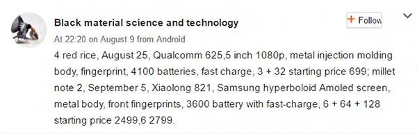 หลังจากที่มีการเปิดเผยข้อมูลบางส่วน รวมถึงภาพตัวเครื่องของสมาร์ทโฟนสุดคุ้มรุ่นต่อไปจากค่าย Xiaomi อย่าง Xiaomi Redmi 4 ออกมาให้ได้ทราบกันตั้งแต่ในช่วงเดือนที่ผ่านมา ล่าสุดได้มีการเปิดเผยรายละเอียดออกมาให้ได้ทราบกันเพิ่มเติมผ่านเว็บโซเชียลมีเดียยอดนิยมอย่าง Weibo โดยระบุไว้ว่า Redmi 4 จะมาพร้อมตัวเครื่องที่ผลิตจากวัสดุประเภทโลหะ และมีคุณสมบัติในเบื้องต้นดังต่อไปนี้