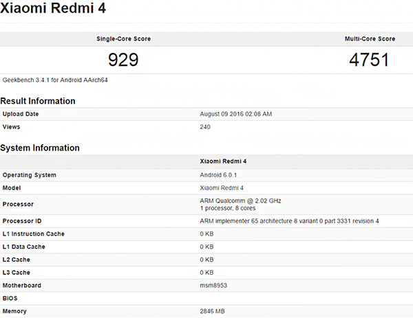 อีกทั้งรายชื่อของ Xiaomi Redmi 4 ยังไปปรากฎอยู่บนเว็บไซต์ทดสอบประสิทธิภาพสมาร์ทโฟน และแท็บเล็ตชื่อดังอย่าง Geekbench ด้วยเช่นกัน ซึ่งเผยให้เห็นผลการทดสอบในด้านการประมวลผลหลายแกน (Multi-Core) ที่ 4,751 คะแนน และด้านการประมวลผลแกนเดี่ยว (Single-Core) ที่ 929 คะแนน พร้อมเผยให้เห็นคุณสมบัติในเบื้องต้นที่สอดคล้องกัน ซึ่งคาดว่าจะทำการเปิดตัวอย่างเป็นทางการในวันที่ 25 สิงหาคมนี้ และมีราคาวางจำหน่ายอยู่ที่ราว 699 หยวน หรือประมาณ 3,700 บาท ซึ่งต้องคอยติดตามกันต่อไปว่าทาง Xiaomi จะเผยโฉมสมาร์ทโฟนสุดคุ้มใหม่ล่าสุดให้ได้ชมกันในเร็วๆ นี้จริงหรือไม่