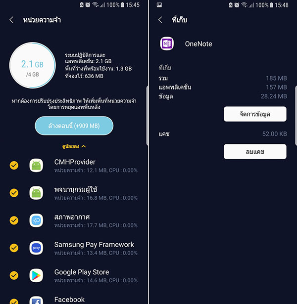 - ลบแคช (Clear Cache) : ปุ่มนี้จะเป็นการลบไฟล์ชั่วคราวซึ่งแอปพลิเคชันดาวน์โหลดมาเก็บไว้ เช่นรูปภาพ วิดีโอ หรือไฟล์สื่อต่างๆ ที่เราเคยดูผ่านแอปนั้นๆ ลบทิ้งแล้วไม่ส่งผลต่อการทำงานของแอปแต่อย่างใด