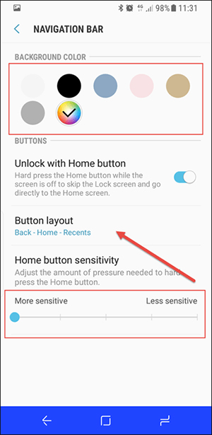 อย่างที่ทราบกันดีว่า Samsung Galaxy S8 ได้เปลี่ยนมาใช้งานปุ่มกดแบบ On-Screen ทั้งหมด ไม่ว่าจะเป็นปุ่มย้อนกลับ (ด้านซ้ายมือ), ปุ่มโฮม (ตรงกลาง) และปุ่ม Recent Apps (ด้านขวามือ) ซึ่งผู้ใช้ท่านใดที่รู้สึกว่าการตั้งค่าปุ่มกดที่เรียงลำดับเช่นนี้ทำให้ใช้งานไม่ถนัด ก็สามารถเข้าไปปรับเปลี่ยนเพื่อสลับตำแหน่งได้ที่เมนู Display Setting > Navigation Bar ซึ่งนอกจากการสลับปุ่มแล้ว ผู้ใช้ยังสามารถปรับแต่งสีสันของ Navigation Bar ตามใจชอบได้ด้วย หรือจะปรับความละเอียดของหน้าจอให้คมชัดที่สุดในระดับ 2K Quad HD ก็ทำได้เช่นเดียวกัน