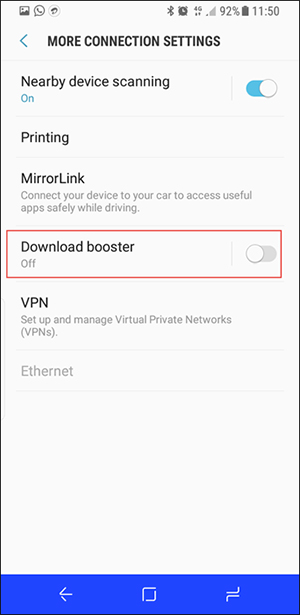 นับเป็นฟีเจอร์ที่น่าสนใจมากทีเดียวสำหรับฟังก์ชัน Download Booster ที่มีให้ใช้งานบน Galaxy S8 โดยเทคโนโลยีดังกล่าวจะช่วยให้การดาวน์โหลดไฟล์ขนาด 30MB ขึ้นไปทำได้รวดเร็วมากยิ่งขึ้น โดยฟังก์ชันนี้สามารถใช้งานร่วมกับ Wi-Fi หรืออินเทอร์เน็ต 4G ได้ทั้งสองแบบ