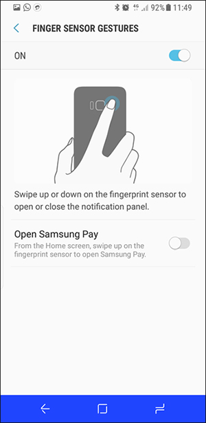 สำหรับเซ็นเซอร์สแกนลายนิ้วมือที่ติดตั้งอยู่บริเวณด้านหลังตัวเครื่อง จะอยู่ในตำแหน่งสามารถใช้นิ้วชี้เอื้อมไปแตะได้ (อาจจะติดกล้องบ้างเป็นบางครั้ง) ซึ่งเซ็นเซอร์สแกนลายนิ้วมือนี้สามารถใช้งานในรูปแบบของ Gesture ได้ด้วย เช่น เมื่อปัดนิ้วลงขณะสัมผัสกับเซ็นเซอร์ จะเป็นการเปิดแถบ Notification บนหน้าจอ เป็นต้น ซึ่งจะช่วยอำนวยความสะดวกให้กับผู้ใช้ โดยไม่ต้องเอานิ้วชี้ของมืออีกข้างมาปัดบนหน้าจอนั่นเอง
