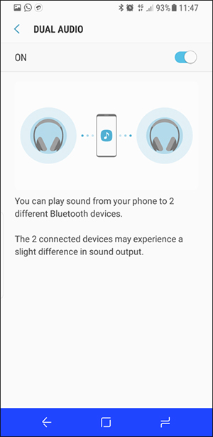 Samsung Galaxy S8 มีฟังก์ชัน Dual Audio ที่สามารถเชื่อมต่อสมาร์ทโฟนเข้ากับหูฟัง Bluetooth ได้พร้อมกัน 2 อุปกรณ์ และสามารถฟังเพลงจากเครื่องเดียวกันได้ทันที เหมาะสำหรับการใช้งานร่วมกับลำโพงไร้สาย 2 เครื่อง เพื่อให้เสียงที่กระหึ่มขึ้นกว่าเดิม