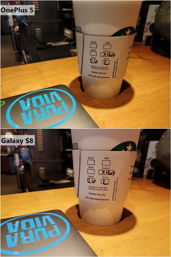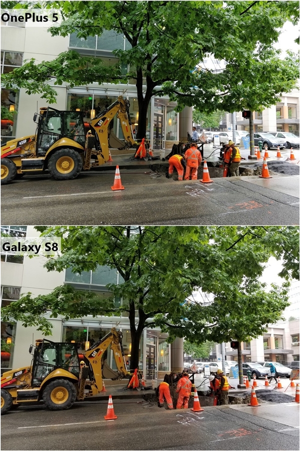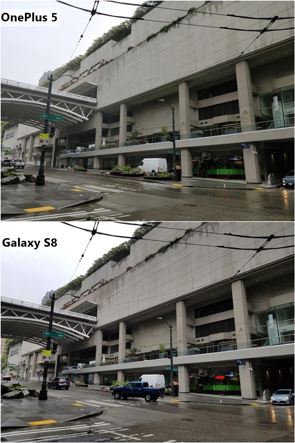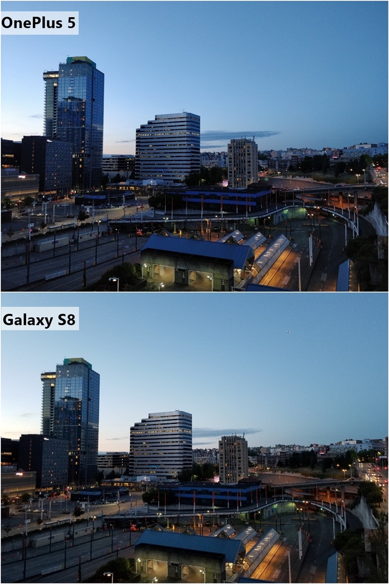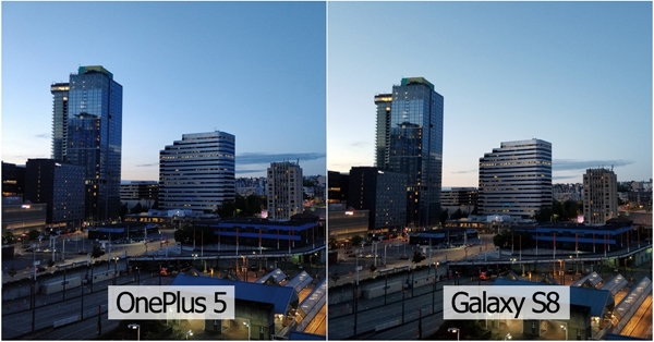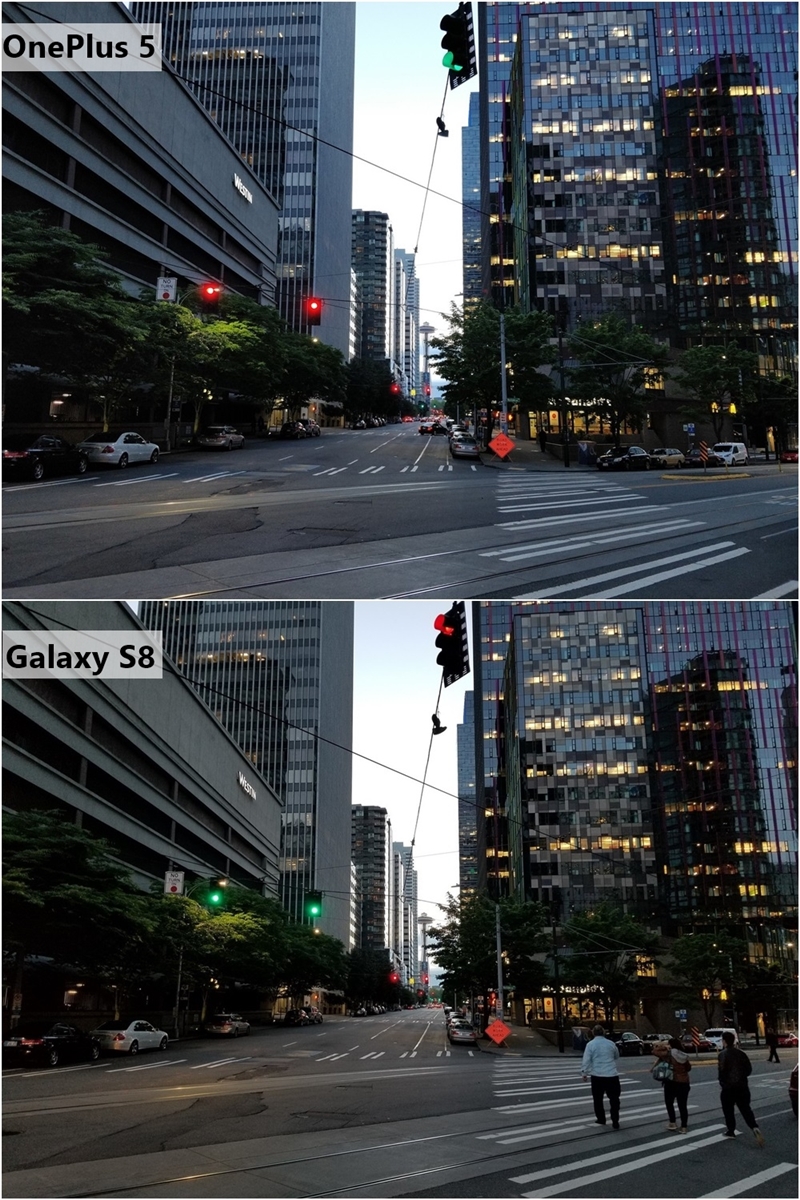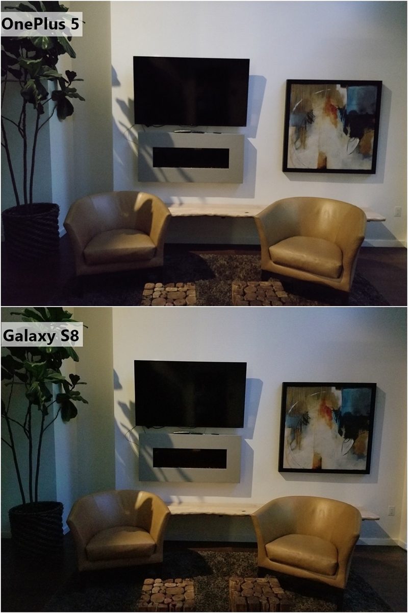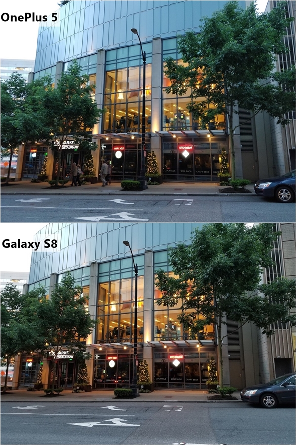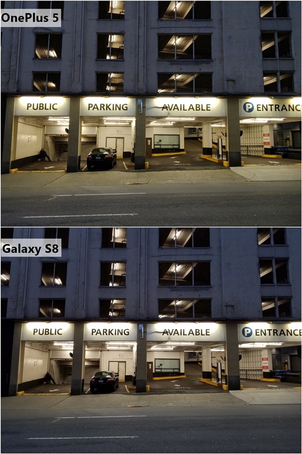 เมื่อลองทดสอบการถ่ายภาพในสภาวะแสงน้อย Android Central พบว่า สมาร์ทโฟนทั้งสองรุ่นเริ่มปรากฏให้เห็นความแตกต่างแล้ว หลัง Galaxy S8 สามารถเก็บภาพได้ค่อนข้างคมชัดกว่า ต่างจากภาพที่เก็บได้จาก OnePlus 5 ซึ่งจะมี Noise ให้เห็นมากกว่า ส่วนเรื่องโทนสีนั้น Galaxy S8 ยังคงให้โทนสีออกเหลืองเช่นเดิม ส่วน OnePlus 5 ก็ให้โทนสีที่เย็นจนเกินไป แต่โดยรวมแล้ว Android Central มองว่า กล้องของ OnePlus 5 ถือว่าทำงานได้ค่อนข้างน่าประทับใจพอสมควร แม้ว่าจะมีจุดอ่อนในเรื่องของโทนสี และการถ่ายภาพในสภาวะแสงน้อยไปบ้าง