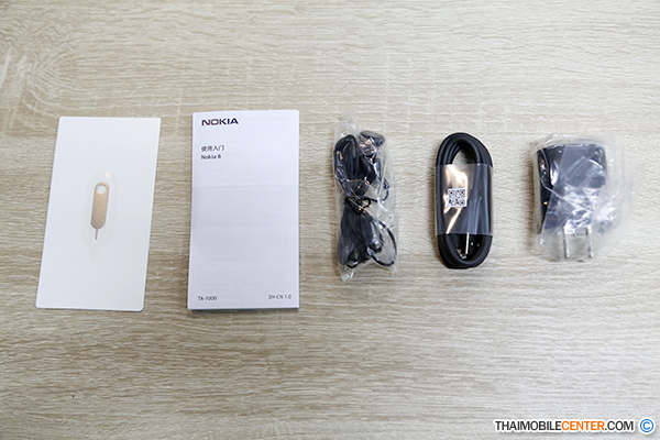 เมื่อเปิดกล่องออกมาก็จะพบกับตัวเครื่อง Nokia 6, หูฟัง, สาย microUSB, อะแดปเตอร์สำหรับชาร์จพลังงาน, เข็มจิ้มถาดซิมการ์ด และคู่มือการใช้งานเบื้องต้น
