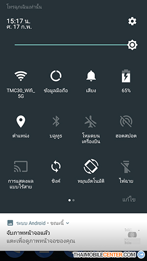 หากปัดนิ้วจากด้านบนของหน้าจอลงมาด้านล่าง จะพบกับแถบการแจ้งเตือน (Notification) และทางลัดในการ เปิด-ปิด ฟังก์ชันต่างๆ