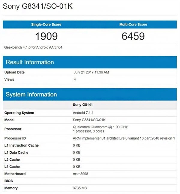 พร้อมกันนี้รายชื่อของ Sony Xperia XZ1 (G8341) ได้ปรากฎอยู่บนเว็บทดสอบประสิทธิภาพสมาร์ทโฟน และแท็บเล็ตชื่อดังอย่าง Geekbench พร้อมเผยให้เห็นผลทดสอบการประมวลผลแบบหลายแกน (Multi-Core) ที่ 6,459 คะแนน และในด้านการประมวลผลแบบแกนเดี่ยว (Single-Core) ที่ 1,909 คะแนน รวมถึงคุณสมบัติตัวเครื่องในเบื้องต้น ได้แก่ ชิปเซ็ตประมวลผล Qualcomm Snapdragon 835 พร้อมหน่วยความจำแรม (RAM) ขนาด 4GB และทำงานอยู่บนระบบปฏิบัติการ Android 7.1.1 Nougat