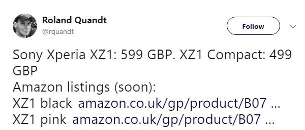 พร้อมกันนี้ Roland Quandt หนึ่งในเจ้าพ่อแห่งข่าวลือในวงการสมาร์ทโฟนได้ทวีตผ่านบัญชีรายชื่อ @rquandt บน Twitter เกี่ยวกับข้อมูลราคาของทั้ง Sony Xperia XZ1 และ XZ1 Compact โดยระบุว่า Sony Xperia XZ1 มีราคา 599 ปอนด์ (ประมาณ 25,600 บาท) และ XZ1 Compact มีราคา 499 ปอนด์ (ประมาณ 21,300 บาท) ตามลำดับ