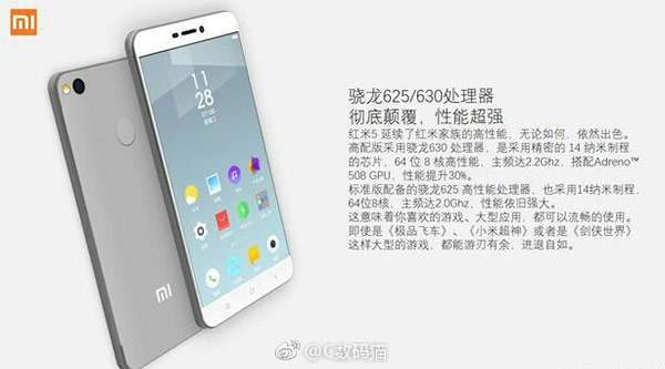แหล่งข่าวแห่งหนึ่งได้เปิดเผยภาพที่คาดว่าจะใช้ในการโปรโมต Xiaomi Redmi 5 ให้ได้ชมกันผ่านทางเว็บโซเชียลมีเดียยอดนิยมในประเทศจีนอย่าง Weibo ซึ่งเผยให้เห็นการดีไซน์ตัวเครื่องที่คล้ายคลึงกับ Xiaomi Redmi 4X พร้อมกันนี้แต่ละภาพยังระบุคุณสมบัติเด่นของ Redmi 5 ไว้อย่างครบครัน ดังนี้