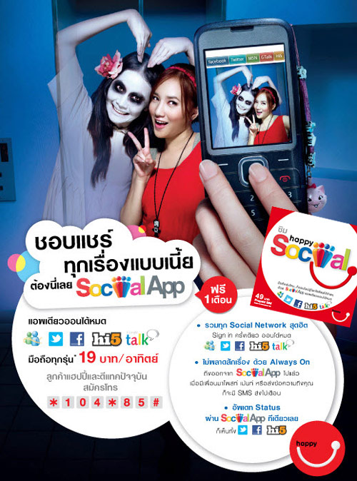 ผู้ใช้บริการต้องศึกษาเงื่อนไขการให้บริการเสริม Social App และเงื่อนไขตามรายการส่งเสริมการขายนี้ได้ที่ wwww.happy.co.th/social หรือ โทร. 1678 dtac call center ค่าโทรครั้งละ 3 บาท (รวมภาษีมูลค่าเพิ่ม)