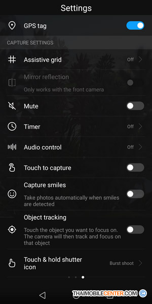 นอกจากนี้ ยังสามารถตั้งค่าการใช้งานเพิ่มเติมได้ ไม่ว่าจะเป็น การปรับความละเอียดของกล้องถ่ายภาพ ซึ่งสามารถปรับได้สูงสุดที่ความละเอียด 16 ล้านพิกเซล, การระบุตำแหน่งบนภาพถ่าย, ตารางเก้าช่อง, การปิดเสียงชัตเตอร์, การตั้งเวลาเพื่อถ่ายภาพ, สามารถสั่งงานถ่ายภาพด้วยเสียงได้, การสัมผัสเพื่อถ่ายภาพ, ระบบตรวจจับรอยยิ้ม, การโฟกัสติดตามวัตถุ, สามารถเพิ่มฟังก์ชันให้กับปุ่มลดระดับเสียง และคืนการตั้งค่าทั้งหมดได้
