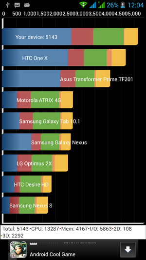 ในส่วนของการทดสอบด้วยโปรแกรม Quadrant Standard นั้น i-mobile IQ X3 ได้คะแนนอยู่ที่ 5143 คะแนน ซึ่งถือว่าอยู่ในระดับที่พอใช้ได้เช่นกัน