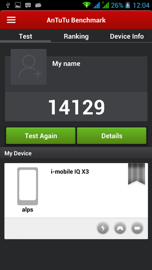 และเมื่อนำ i-mobile IQ X3 มาทดสอบด้วยโปรแกรม Antutu Benchmark พบว่า i-mobile IQ X3 ได้คะแนนรวมอยู่ที่ 14129 คะแนน ซึ่งเมื่อนำคะแนนที่ได้มาจัดอันดับ พบว่า i-mobile IQ X3 จะได้อันดับที่ 11 ถือว่าเป็นอันดับที่พอใช้ได้