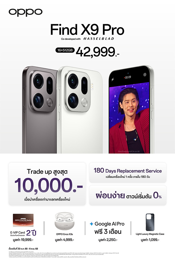 - OPPO Find X9 รุ่น RAM 12GB+ROM 256GB ราคา 29,999 บาท