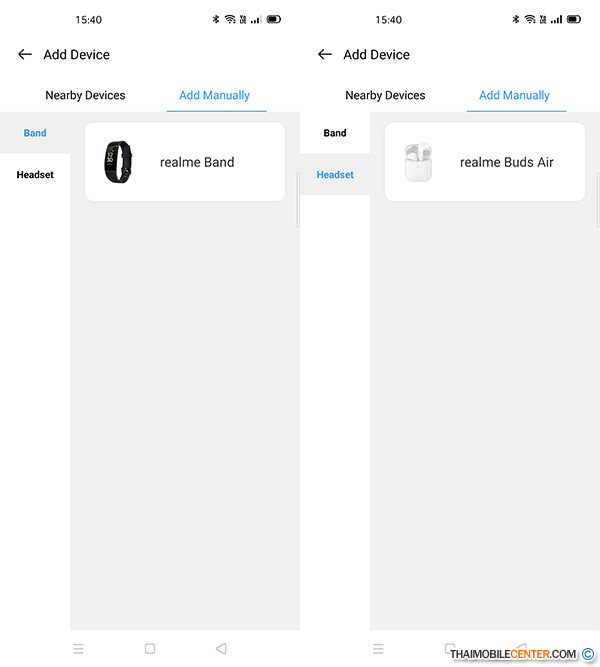 เมื่อติดตั้งแอปพลิเคชัน realme Link เรียบร้อยแล้ว ให้ทำการเปิด Bluetooth บนสมาร์ทโฟนเพื่อเริ่มการเชื่อมต่อกับ realme Band พร้อมกดเพิ่มอุปกรณ์ที่ต้องการเชื่อมต่อ ทั้ง realme Band และ realme Buds Air ซึ่งจะมีให้เลือกเพิ่มด้วยตนเอง หรือให้ค้นหาโดยอัตโนมัติ