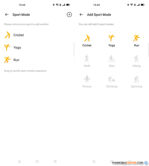 โหมดกีฬา โดยสามารถเลือกให้แสดงผลมากสุด 3 รูปแบบ เช่น Walk, Run และ Yoga พร้อมโหมดพิเศษอย่าง Cricket