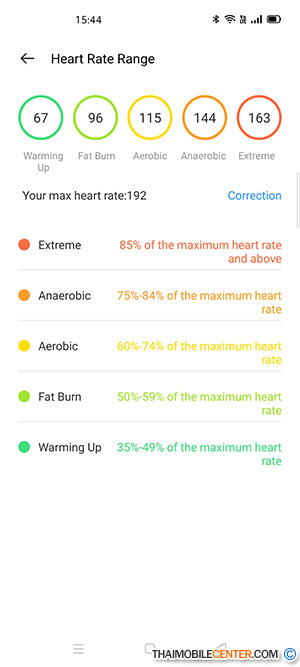 อัตราการเต้นของหัวใจ สามารถกดค้างที่ปุ่มด้านล้างเพื่อเริ่มการวัด แต่โดยปกติแล้วตัว realme Band จะทำการวัดแบบอัตโนมัติทุกๆ 5 นาที
