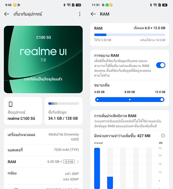 ในด้านหน่วยความจำ ตัวเครื่องมาพร้อม RAM ขนาด 6GB และรองรับฟีเจอร์ Dynamic RAM Expansion ที่สามารถนำพื้นที่ ROM มาช่วยเพิ่ม RAM เสมือนได้สูงสุดอีก 12GB รวมเป็น 18GB ช่วยให้การเปิดใช้งานหลายแอปพร้อมกัน การสลับแอป หรือการใช้งานต่อเนื่องเป็นไปอย่างลื่นไหลมากยิ่งขึ้น