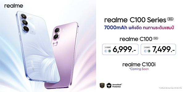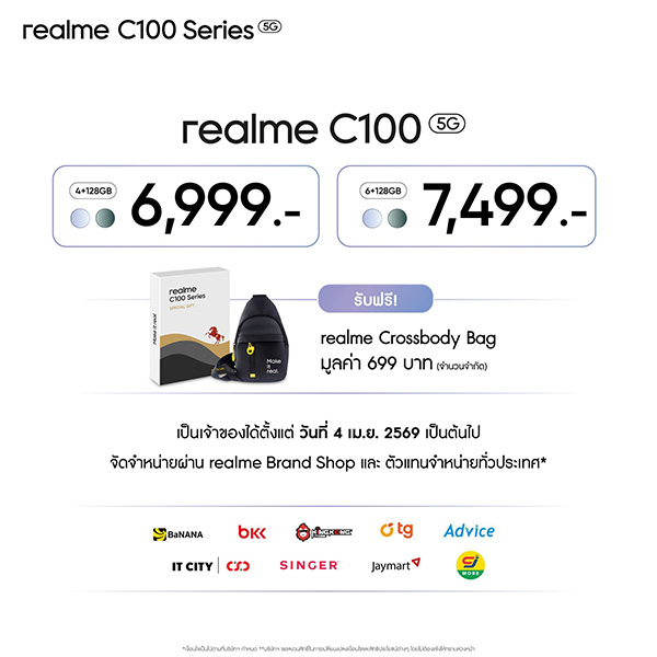 realme C100 5G จะเริ่มวางจำหน่ายอย่างเป็นทางการในประเทศไทยตั้งแต่วันที่ 4 เมษายน 2569 เป็นต้นไป โดยมีให้เลือก 2 รุ่น 2 ราคาดังนี้