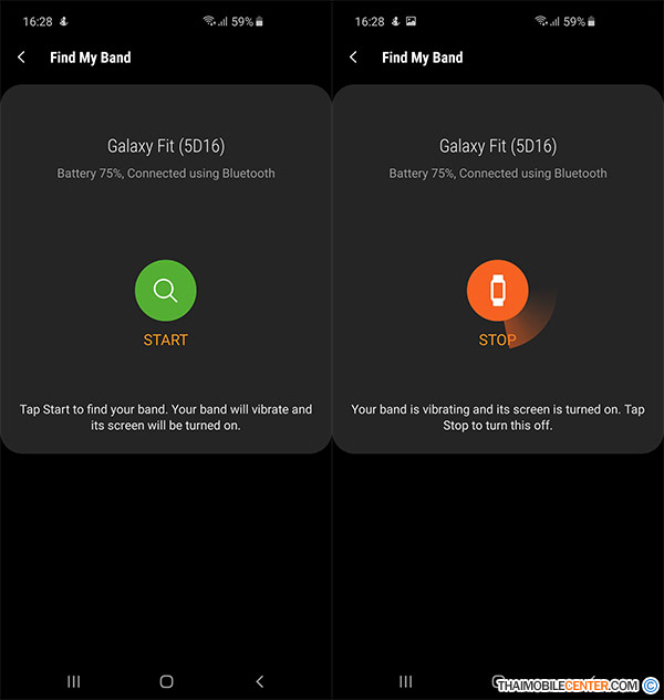 สามารถค้นหา Samsung Galaxy Fit ได้ด้วยเมนู Find My Band โดยเมื่อกด Start ตัวหน้าจอของ Galaxy Fit จะติด และสั่นจนกว่าผู้ใช้จะกดหยุดค้นหา