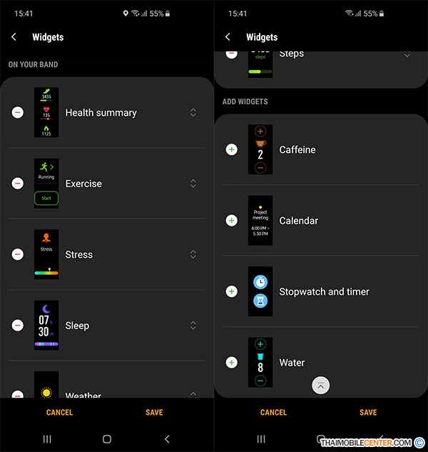 และยังสามารถเพิ่มการแสดง Widgets เมนูที่น่าสนใจบน Galaxy Fit ได้อีกด้วย ไม่ว่าจะเป็น ตัวนับจำนวนการดื่มกาแฟประจำวัน, ปฏิทินสำหรับการแจ้งเตือน, แคลอรี่, ตัวนับจำนวนก้าว, การจับเวลา / นับถอยหลัง และตัวนับปริมาณน้ำที่ดื่มในแต่ละวัน