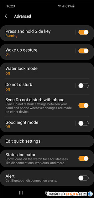 สามารถตั้งค่าด้านอื่นๆ แบบ Advanced ได้เพิ่มเติม ไม่ว่าจะเป็น การตั้งค่าเมื่อกดปุ่มข้างตัวเครื่องค้าวไว้ เพื่อเข้าสู่กิจกรรมการออกกำลังกายหลัก, ยกตัวเครื่องเพื่อเปิดหน้าจอ, เปิด-ปิด Water Lock Mode ที่เมื่อเปิดใช้งานตัว Galaxy Fit จะล็อกไม่ให้กดหน้าจอ หรือปุ่มด้านข้างได้, ฟังก์ชัน Do Not Disturb ที่สามารถตั้งค่าแยกออกมา หรือตั้งค่าให้ Sync กับค่าในสมาร์ทโฟนก็ได้, เปิด-ปิด Good Night Mode ที่จะช่วยไม่ให้หน้าจอติดขึ้น หรือมีการสั่นจากการแจ้งเตือนขณะหลับ ยกเว้นนาฬิกาปลุก