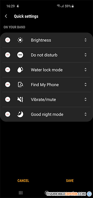 สามารถเข้าสู่หน้า Quick Setting ได้เพียงปัดหน้าจอลงด้านล่าง ประกอบด้วย ค่าความสว่าง, โหมด Do Not Disturb, Water Lock Mode, Find My Band, เปิด-ปิด การสั่น และ Good Night Mode