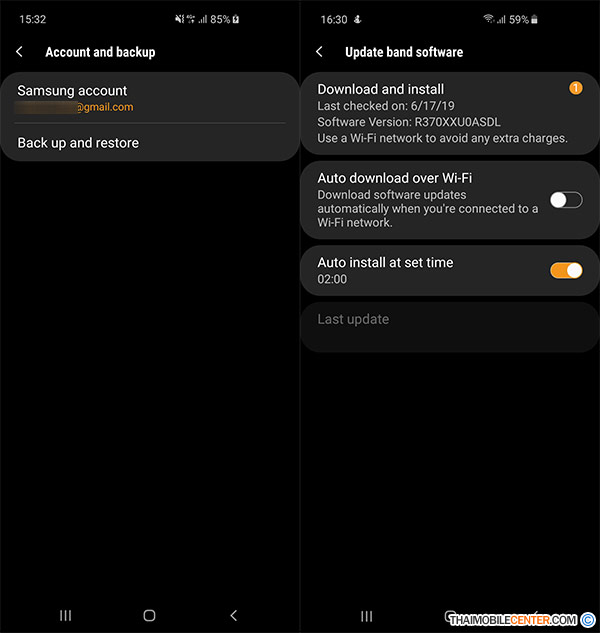 นอกจากนี้ยังสามารถ Backup หรือ Restore ข้อมูลได้โดยเชื่อมต่อเข้ากับ Samsung Account และในเมนู About Phone ผู้ใช้สามารถตรวจสอบระบบปฏิบัติการเวอร์ชันใหม่ของ Galaxy Fit ได้ รวมถึงการ Reset ใหม่