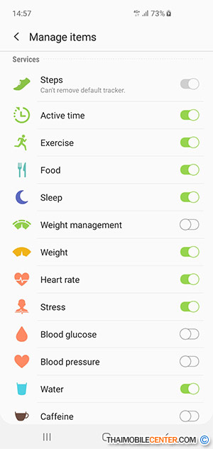 แอปพลิเคชัน Samsung Health รองรับกับชนิดกีฬา หรือการออกกำลังแทบทุกประเภท รวมถึงรองรับการเก็บข้อมูลจากการดำเนินชีวิตประจำวันได้ในเชิงลึก