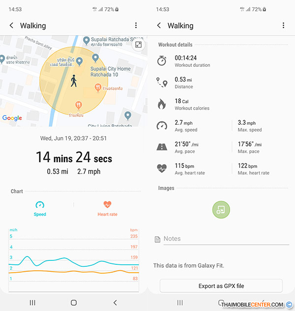และอีกหนึ่งแอปพลิเคชันที่ขาดไม่ได้ในการใช้งาน Samsung Galaxy Fit ก็คือ Samsung Health ที่คอย Sync ข้อมูลจาก Galaxy Fit ไปยังสมาร์ทโฟน พร้อมวิเคราะห์สถิติต่างๆ ของการออกกำลังหายที่เกิดขึ้น รวมถึงช่วยสรุปข้อมูลให้ผู้ใช้งานได้ดูผ่านทางอินเตอร์เฟสที่เรียบง่าย สบายตา และเข้าใจง่าย โดยช่วยติดตาม และสรุปสถิติของการออกกำลังกายที่เกิดขึ้นในแต่ละวัน จึงช่วยให้ผู้ใช้งานสามารถรู้ได้โดยง่ายว่าตัวเองนั้นมีการออกกำลังกาย หรือมีการดูแลสุขภาพที่เพียงพอหรือไม่