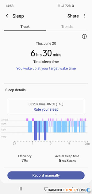 หากคุณสวมใส่ Samsung Galaxy Fit ขณะนอนหลับ ก็จะมีการบันทึกระยะเวลาทั้งหมดในการนอน รวมถึงเวลาเริ่มนอนหลับ จนถึงตื่นนอนให้ด้วยเช่นกัน