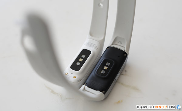 ที่ด้านหลังของตัวเรือนของทั้ง Samsung Galaxy Fit และ Galaxy Fit e จะมีเซ็นเซอร์ตรวจวัดอัตราการเต้นของหัวใจ (Heart Rate Monitor) กับขั้วชาร์จแบตเตอรี่ในดีไซน์เดียวกัน